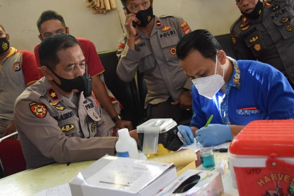 Kapolres Bone AKBP Try Handako Wijaya Putra,S.IK bersama Wakapolres Bone Kompol M.Asrofi,S.H.,M.H. dan Wadan Yon C Pelopor Sat Brimob Polda Sulsel AKP Andi Muhammad Syafei,S.Sos.,M.H. juga turut hadir ambil bagian dalam kegiatan donor darah yang berlangsung hari ini. Kamis 10 Juni 2021.