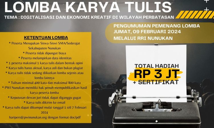 NUNUKAN – Persatuan Wartawan Indonesia (PWI) Nunukan secara resmi mengumumkan lomba karya tulis untuk kategori siswa-siswi SMA/sederajat se-Kabupaten Nunukan. Dalam kegiatan ini, PWI Nunukan berkolaborasi dengan Bankaltimtara Cabang Nunukan.