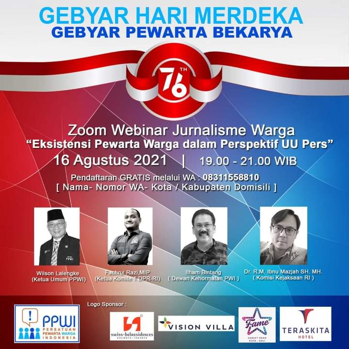 Hal tersebut terbukti efektif dan terus melakukan gebrakan-gebrakan. Kali ini, dalam rangka menyemarakkan Peringatan 76 tahun kemerdekaan Indonesia, PPWI menyelenggarakan kegiatan webinar Jurnalisme Warga secara virtual.
