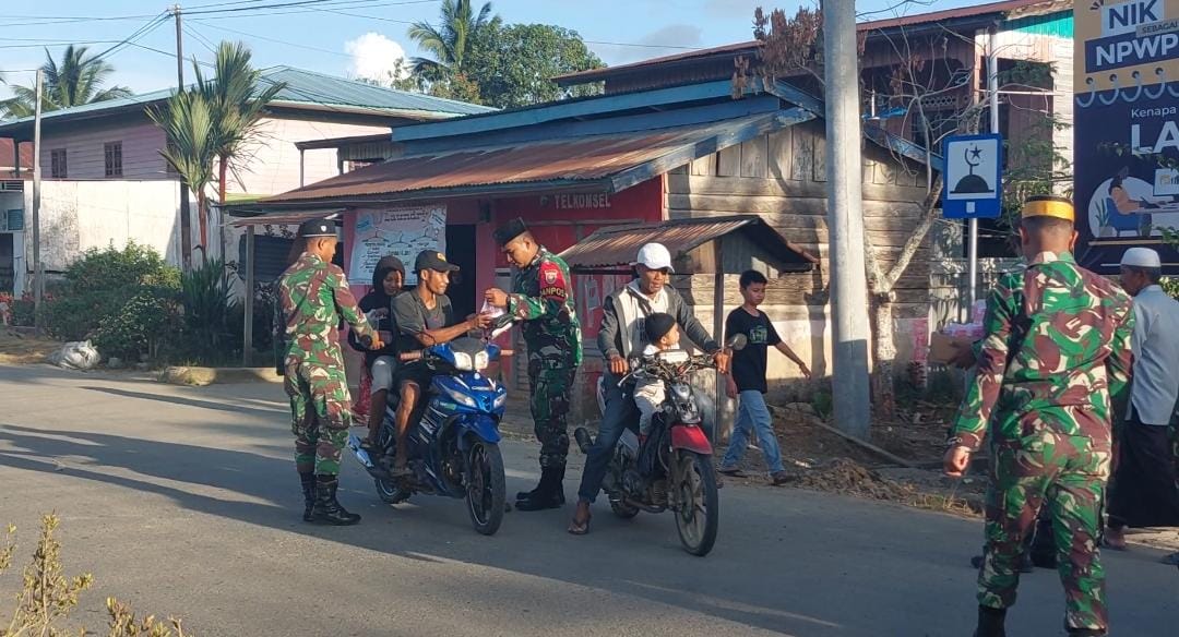 Dengan suasana penuh kehangatan dan kekeluargaan, kegiatan yang dilaksanakan personil Pos Aji Kung membagikan takjil berbuka puasa kepada masyarakat yang melintas dan juga berkeliling ke rumah-rumah warga, kegiatan bagi-bagi takjil ini selain sebagai salah satu bentuk serbuan teritorial di wilayah binaan, juga untuk mendekatkan diri dan mempererat tali silaturahmi dengan warga setempat.