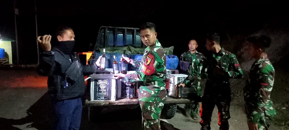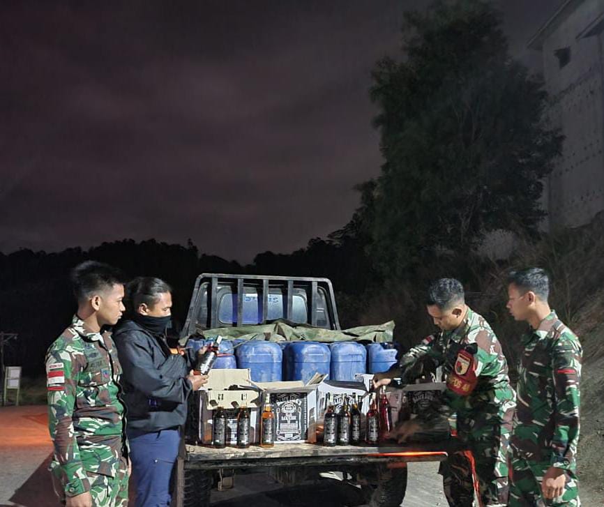 Kemudian, Satgas Pamtas menyampaikan bahwa saat diperiksa, ditemukan 6 kardus yang berisikan minuman keras tersebut.