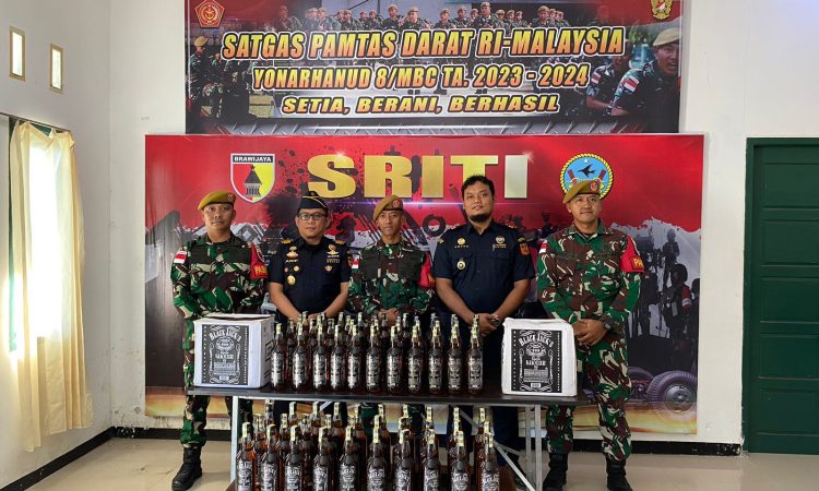 NUNUKAN – Satuan Tugas Pengamanan Perbatasan (Satgas Pamtas) RI-Malaysia Yonif Pertahanan Udara (Yon Arhanud) 8/Marawaca Bhuana Cakti (MBC) bersama Satgas Bais Catur berhasil gagalkan penyelundupan minuman keras asal Malaysia di Desa Bambangan, Kecamatan Sebatik Barat, Minggu (28/01/2024).