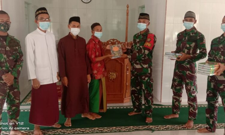 Dansatgas mengatakan Kegiatan pembagian Al-Qur’an ini dipimpin langsung oleh Danpos Bantas Letda Inf Warsito beserta 5 orang anggota Pos Bantan selepas melaksanakan Shalat Jumat yang diterima oleh Bapak Herman selaku DKM Masjid Baitul Mugni.