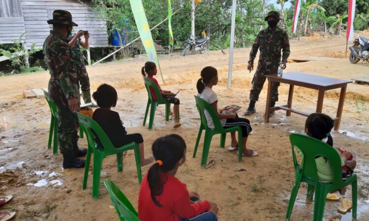 “Setiap disela istirahat dalam mengerjakan sasaran, Personel Satgas meluangkan waktu untuk belajar bersama anak-anak Desa Binusan Dalam”, Peltu Chandra.