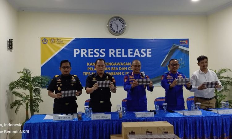 NUNUKAN – Kantor Pengawasan dan Pelayanan Bea dan Cukai (KPPBC) Tipe Madya Pabean C Nunukan serah terima barang pelimpahan perkara dan barang bukti kasus pengungkapan rokok pakai pita cukai palsu di Nunukan.