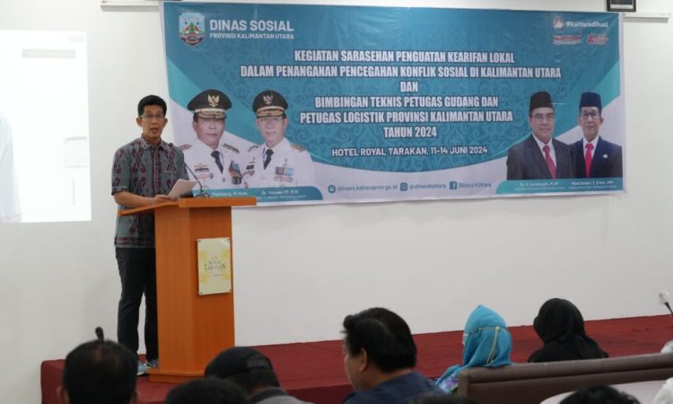 TARAKAN – Dinas Sosial Provinsi Kalimantan Utara (Kaltara) melaksanakan kegiatan sarasehan penguatan kearifan lokal dalam penanganan pencegahan konflik sosial di Kaltara dan bimbingan teknis (Bimtek) petugas gudang dan petugas logistik Provinsi Kaltara tahun 2024 di Hotel Royal Tarakan, Rabu (12/6/2024).