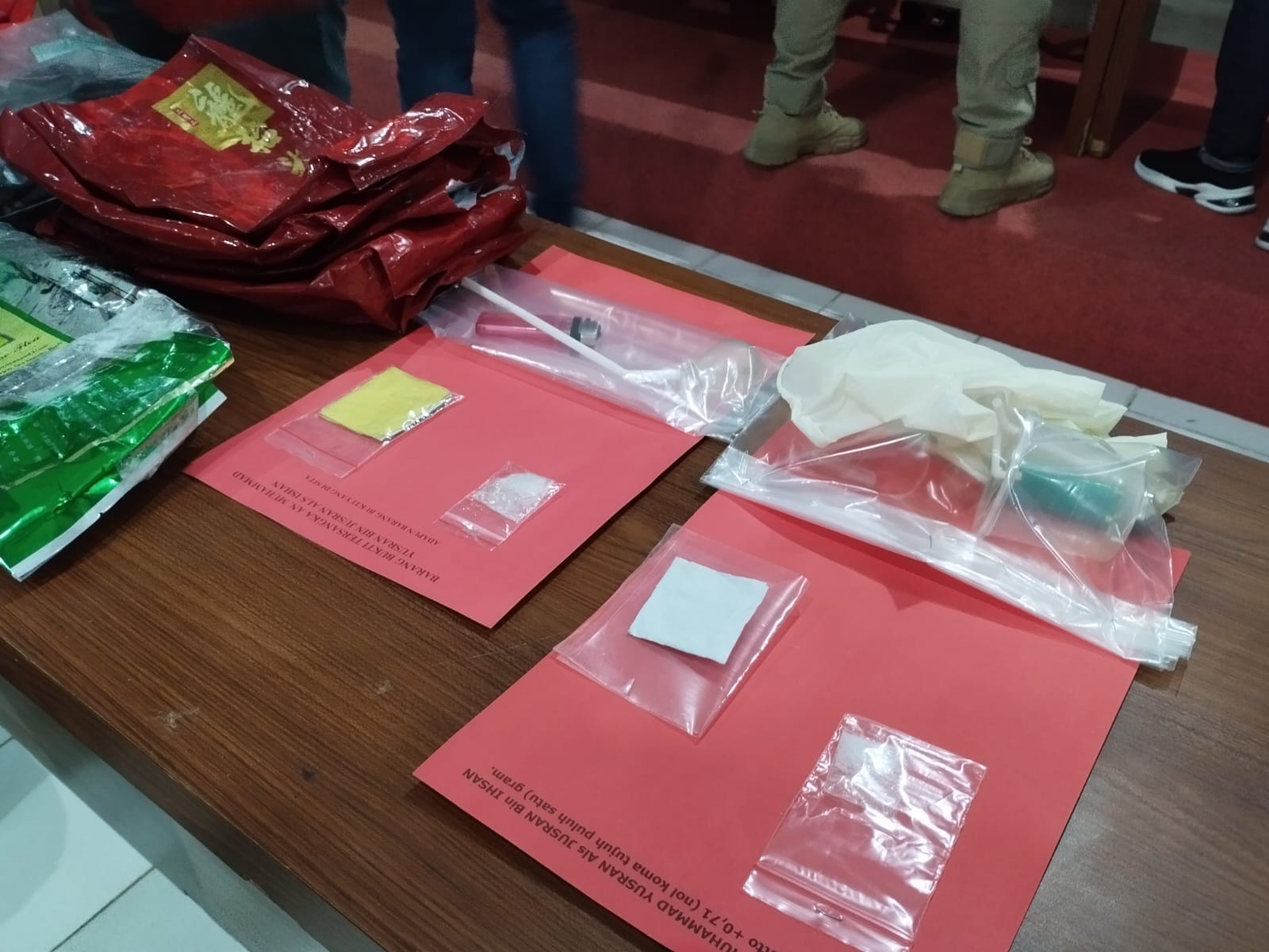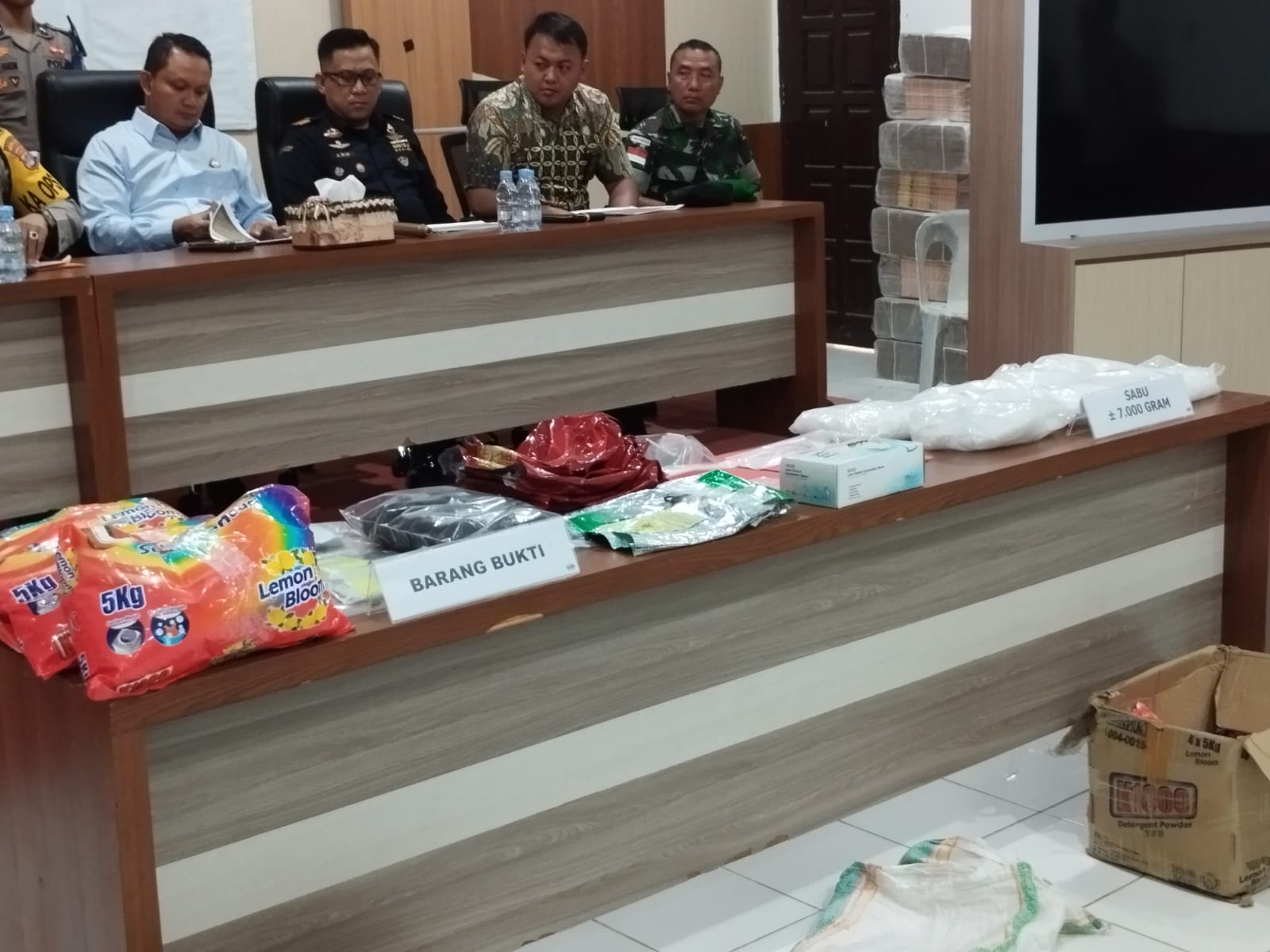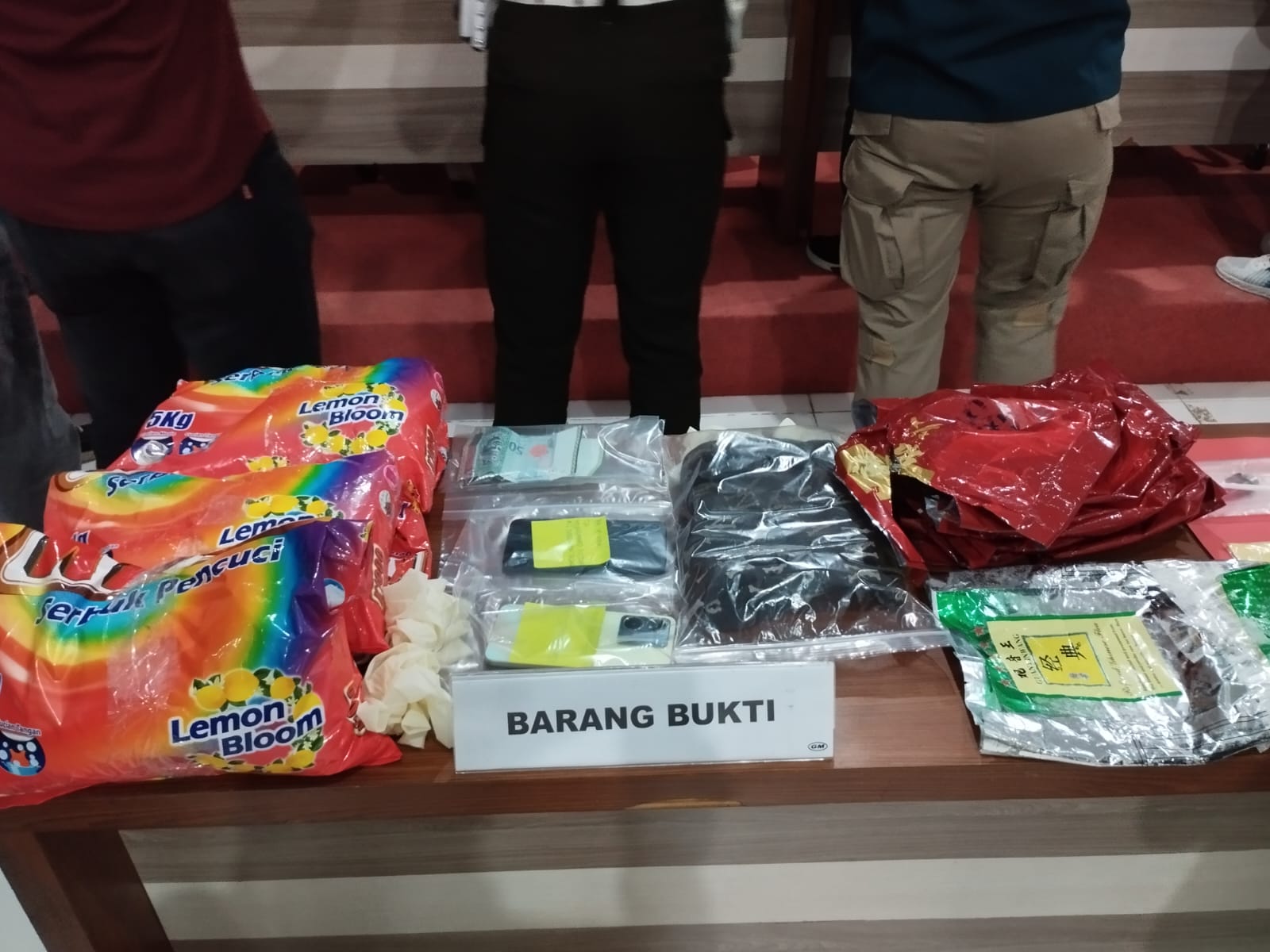 Setelah pemeriksaan lebih lanjut, ditemukan barang bukti (BB) diantaranya 7 bungkus plastik ukuran besar warna transparan yang diduga berisi narkotika gol I jenis sabu dengan berat bruto ±7.000 gram, 1 buah bungkusan teh cina merk “Guanyinwang”, 5 buah bungkusan plastik warna merah bertuliskan huruf cina, 4 buah sabun detergent bubuk merk “K1000”, gulungan plastik warna transparan, 2 buah karung warna putih, empat buah kardus coklat merk “K1000”, uang tunai RM 100, 1 buah handphone warna gold merk “Vivo”, 1 buah handphone warna hitam merk “Samsung”, 2 alat hisap saby berupa tabung/bong, kaca fanbo, pipet, korek gas, 1 lembar celana pendek warna hitam, 1 lembar potongan kertas warna putih, 2 bungkus plastik ukuran kecil warna transparan yang diduga masing-masing berisi narkotika gol I jenis sabu dengan berat bruto ± 0,6 gram dan ± 0,82 gram.
