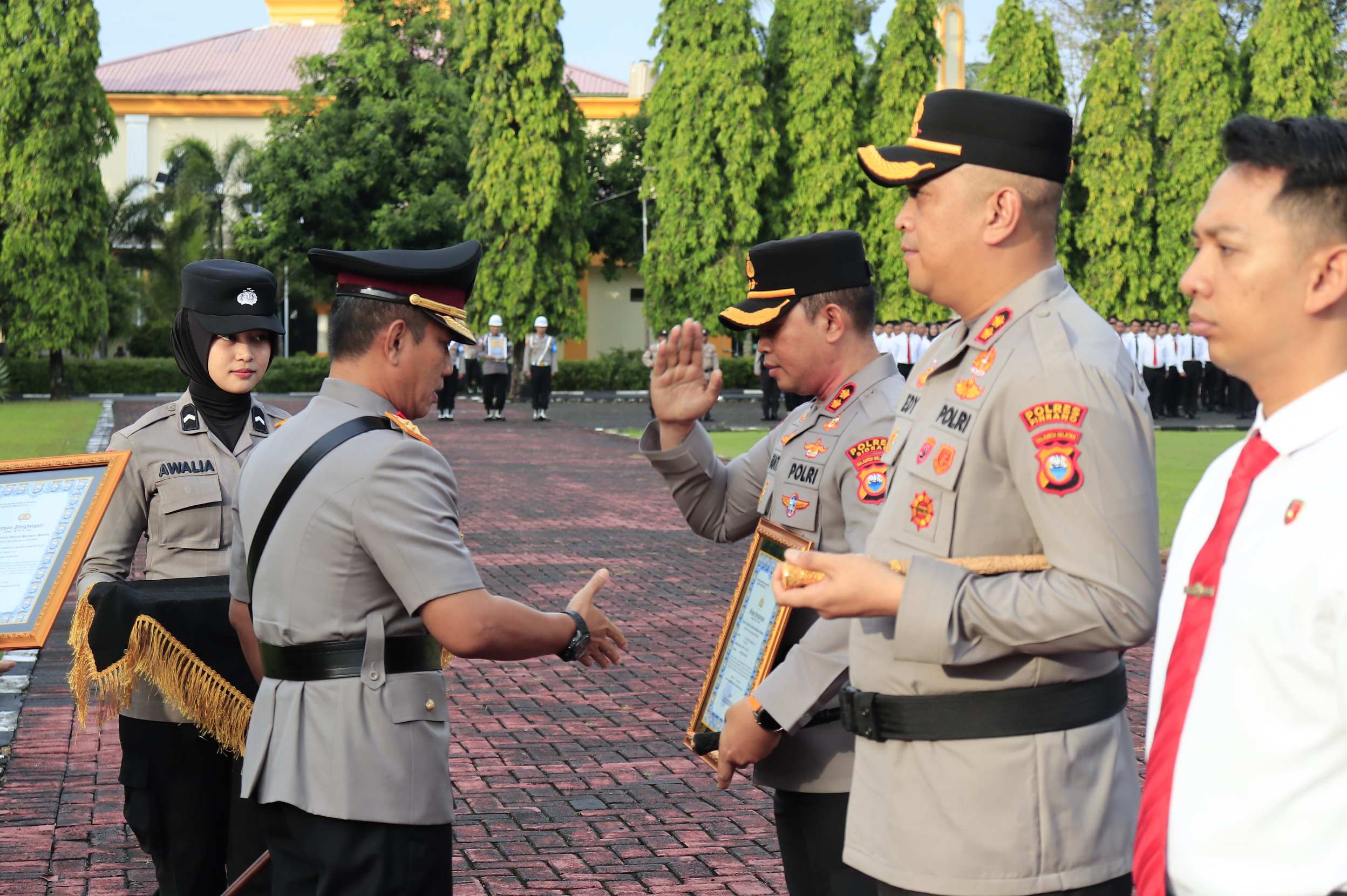 Adapun sebagai perwakilan penerima penghargaan AKBP Dr. FANTRY TAHERONG, S.H., S.I.K., M.H. Kapolres Sidrap beserta 18 personel, AKBP EDY SABHARA MANGGABARANI, S.I.K. Kapolres Pinrang beserta 48 personel Ditreskrimum dan Polres Palopo, AKP LUMBRIAN HAYUDI PUTRA, S.I.K., M.H. Kasi Pammat Ditsamapta beserta 5 personel, AKP BAHTIAR, S.Sos., S.H., M.H. Kasatreskrim Polres Gowa beserta 47 personel dan IPTU DIDI SUTIKNO MUGIARNO, S.Tr.K., CPHR. Kasatresnarkoba Polres Sidrap beserta 14 personel.