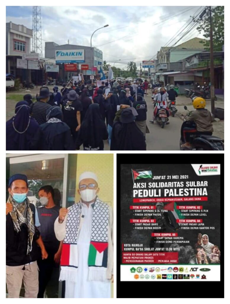 Mamuju Sulbar . Bertepatan 9 syahwal 1442 H , Jum’at 21 Mei 2021 masyarakat Sulbar peduli Palestina telah melakukan aksi solidaritas dan sebelum dilaksanakan shalat Jumat dirangkai dengan khotbah seragam denagn PEDULI PALESTINA , Jumlah peserta aksi solidaritas peduli palestina kurang lebih 300 orang,terdiri dari 5 titik , Titik tumpul I start di Simpang 5 jalan tuna finish depan matos , titik tumpul II Start samping 5 PLN finish depan level 5,titik tumpul III start pasar baru finish depan kodim Mamuju , titik tumpul IV start pasar lama finish didepan kantor pos Mamuju Waktu kumpul ba’da ashar Jum’at 13.30 wita