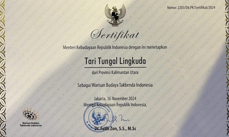 JAKARTA – Tari Tungal Lingkuda, salah satu tarian tradisional dari suku Tidung di Kalimantan Utara (Kaltara), resmi dinobatkan sebagai Warisan Budaya Takbenda (WBTB) Indonesia pada acara Apresiasi Warisan Budaya Indonesia (AWBI) Tahun 2024 oleh Menteri Kebudayaan RI, Fadli Zon di Taman Fatahillah, Kawasan Kota Tua, Sabtu (16/11) malam.