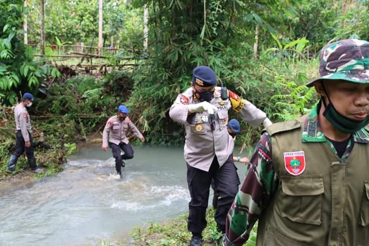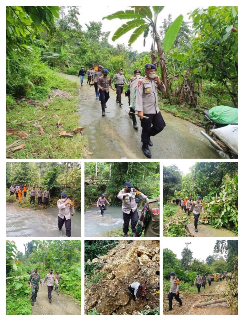 Dalam proses evakuasi ini, jalan yang dilalui cukup berat dan terjal dan menyeberangi sungai karena akses jalan tertimbun longsor. Tampak Komandan Batalyon Penugasan (Danyon Gas) Kompol Nur Ichsan, S.Sos. bersama anggota bahu membahu membantu warga yang mengungsi dengan memikul barang korban longsor untuk di evakuasi ke tenda pengungsian.