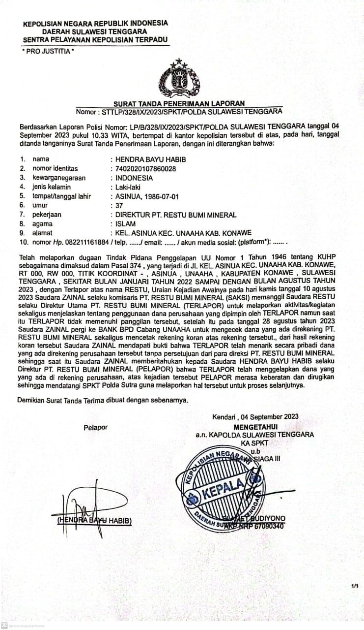 Restu Tebara yang saat ini menjabat sebagai komisioner Bawaslu Konawe, resmi dilaporkan oleh managemen perusahaan di Kepolisian Daerah (Polda) Sulawesi tenggara (Sultra) dengan Nomor : STTLP/328/IX/2023/SPKT/ atas dugaan dengan tuduhan melakukan penggelapan dana dalam jabatan, Senin (4/9/2023).