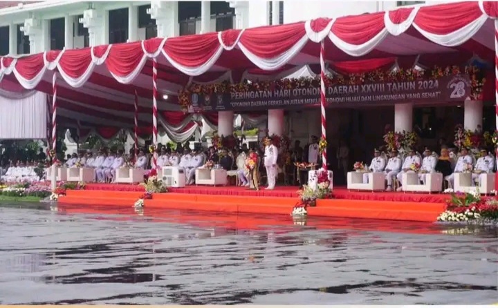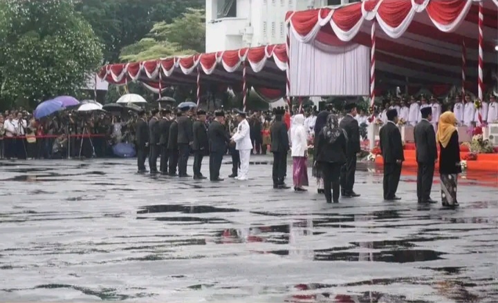 NUNUKAN- Upacara puncak peringatan Hari Otonomi Daerah (Otoda) XXVIII di Balai Kota Surabaya hari ini, Kamis (25/4/2024) tetap berlanjut dilaksanakan meski sempat berhenti sementara karena hujan deras.