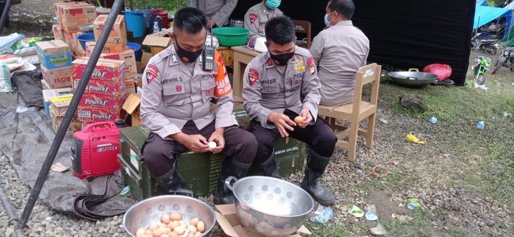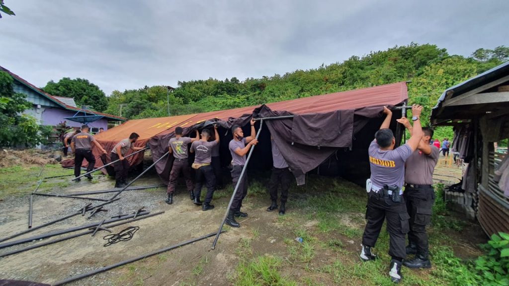 para personel Brimob Polda Sulawesi Selatan ini langsung bergegas mendirikan tenda-tenda darurat yang akan digunakan sebagai posko dan dapur lapangan tanggap bencana untuk membantu korban gempa Sulbar.