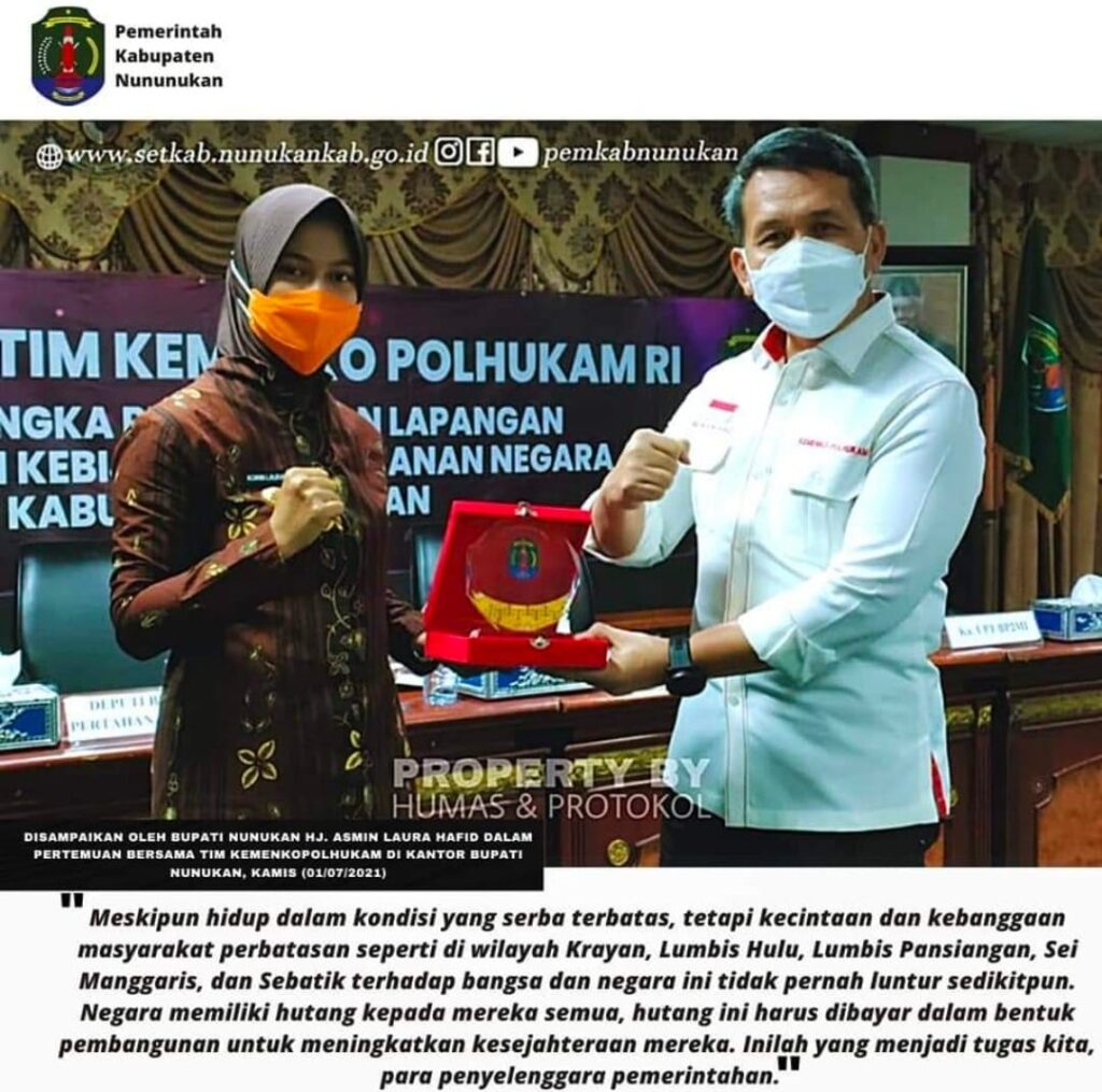 Selanjutnya Asmin Laura menyampaikan bahwa sebagian besar wilayah Kab. Nunukan merupakan perbatasan dengan Negara bagian Serawak dan Sabah, Malaysia. Kabupaten Nunukan juga merupakan salah satu perlintasan atau pintu masuk para WNI atau TKI yang ingin bekerja di Malaysia. Karena menjadi perlintasan, tidak heran jika secara demografi masyarakat di Kab. Nunukan memiliki latar belakang tang sangat beragam, mulai dari suku, agama, maupun adat istiadat dan budaya.