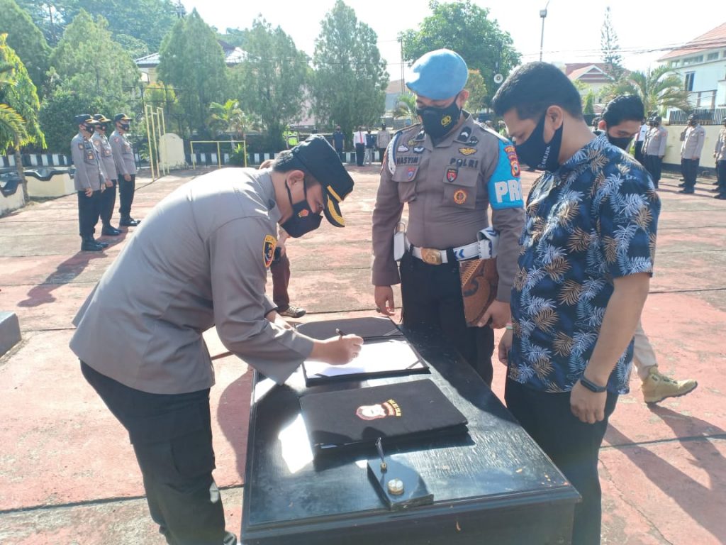Sinjai – Berandankrinews.com Bertempat dihalaman Mapolres Sinjai, Kepolisian Resor Sinjai menggelar apel pagi dirangkaikan MOU dengan OK Jack bidang pelayanan publik Polres Sinjai secara on line. Senin pagi (22/2/2021) pukul 08.00 wita.
