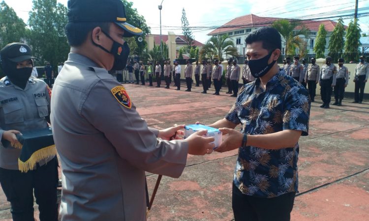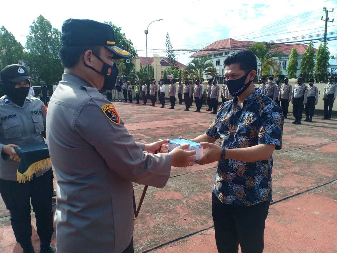 Selanjutnya pemberian dari masker dari Kapolres Sinjai kepada OKJack secara simbol yang diterima oleh Owner aplikasi OKJack Kab. Sinjai Iswan.