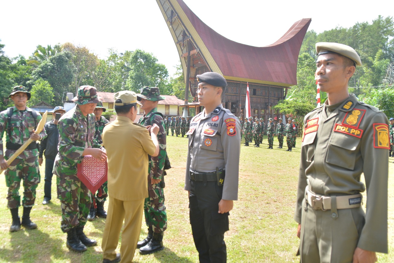 Sebagai tanda dibukanya TMMD ke-115 TA 2022, Wakil Bupati Tana Toraja secara simbolis memasang pita dan menyerahkan alat kerja kepada tiga perwakilan pelaku TMMD Ke-115 Kodim 1414/Tana Toraja.