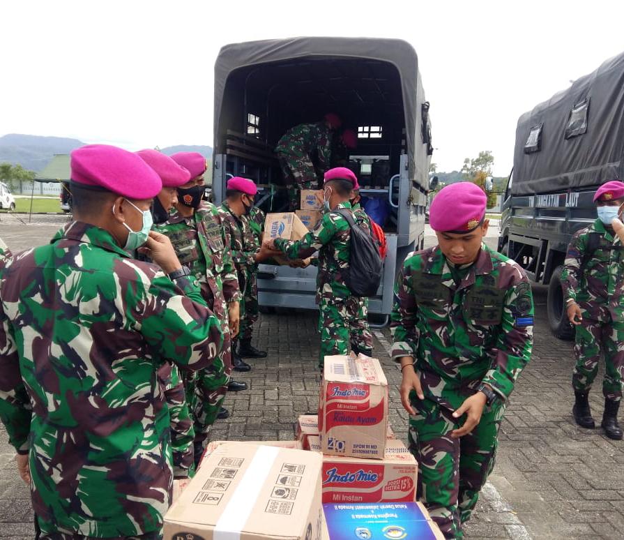 Jakarta, 19 Januari 2021, TNI Angkatan Laut (TNI AL) mendistribusikan bantuan kepada 438 korban gempa bumi di Mamuju yang diserahkan secara simbolis oleh Komandan Satgas Penanggulangan Bencana Alam TNI AL Kabupaten Mamuju Kolonel Marinir Y. Rudy Sulistyanto, S.E., kepada perwakilan pengungsi di Pos Komando (Posko) TNI AL Lanal Mamuju. Jl. Arteri No. 1 Kelurahan Rangas Kecamatan Simboro, Kabupaten Mamuju Provinsi Sulawesi Barat, Selasa, (19/1).