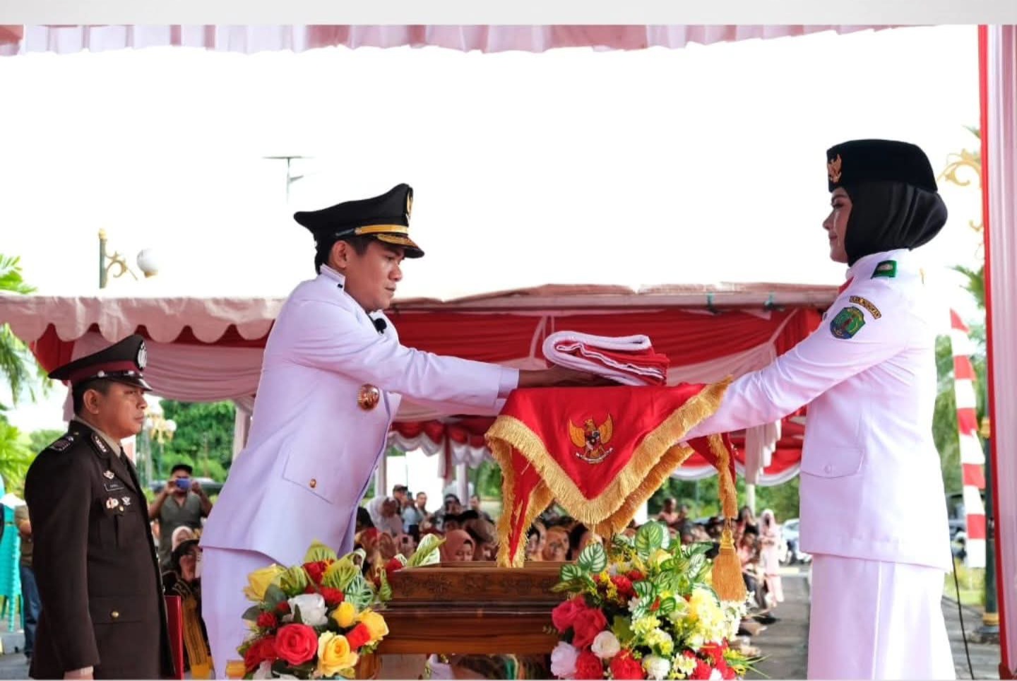 Bupati mengenakan Pakaian Dinas Upacara (PDU) berwarna putih lengkap dengan topi dan tanda kepangkatan.