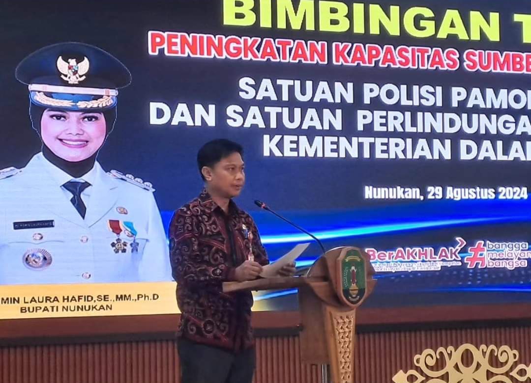 NUNUKAN – Mewakili Bupati Nunukan Hj. Asmin Laura Hafid, Plt. Sekretaris Daerah H. Asmar membuka secara resmi Bimbingan Teknis Peningkatan Kapasitas SDM Satpol PP dan anggota Satlinmas Kabupaten Nunukan tahun 2024 diselenggarakan di ruang serbaguna lantai V Kantor Bupati Nunukan, Kamis (29/08).