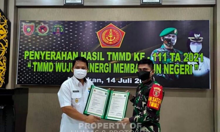 NUNUKAN – Mewakili Bupati Nunukan Wakil Bupati Nunukan, H. Hanafiah, SE., M.Si menghadiri acara Penutupan TMMD ke 111 Tahun 2021di Aula Makodim 0911/Nnk, Rabu (14/07).