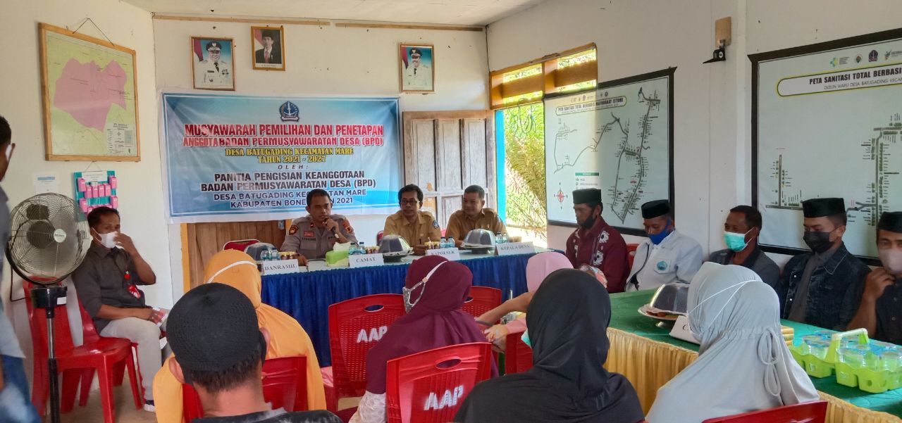 Wakapolsek Mare Polres Bone Ipda H.Yukhaidir,S.Sos mewakili Kapolsek Mare menghadiri pemilihan dan penetapan anggota BPD desa Batu Gading Kecamatan Mare Kabupaten Bone Dengan masa bakti 2021-2026 di aula kantor desa Batu Gading, Senin (22/03/2021)