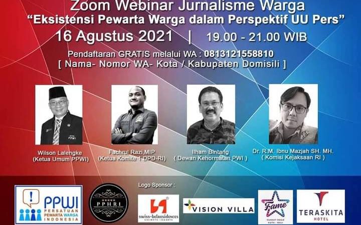 Jakarta -Berandankrinews.com. Webinar Jurnalisme Warga dengan tema “Eksistensi Pewarta Warga dalam Perspektif Undang-Undang Pers” sukses digelar pada Senin, 16 Agustus 2021. Hal ini terlihat dari antusiasme peserta yang memenuhi ruang webinar. Tidak kurang dari 500-an pendaftar dari Sabang sampai Merauke mengikuti webinar tersebut dengan tekun dan seksama dari awal hingga akhir acara [1].