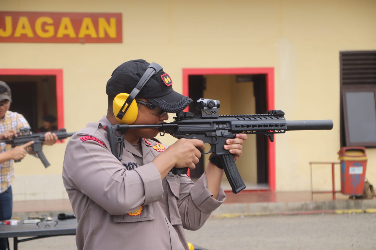 Terlihat, Danyon, Kapolres dan Dandim begitu serius membidik sasaran.